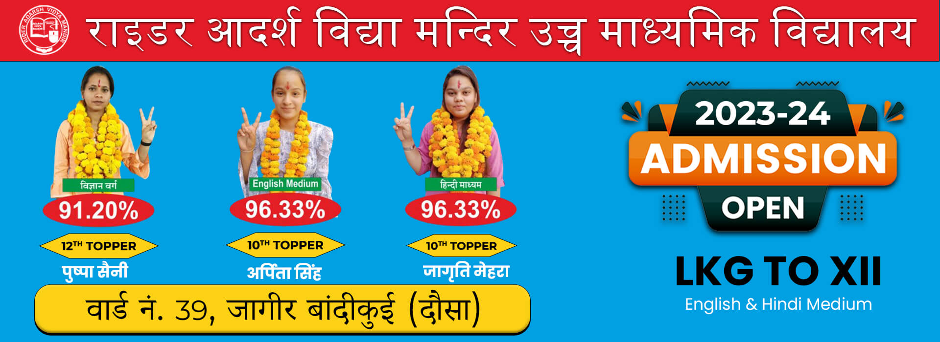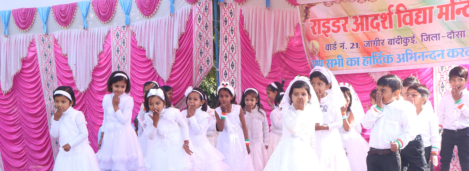 Rider Adarsh Vidya Mandir Upper primary School is a Hindi/ English Medium, Co-educational School situated in Ward no. 26 Jageer Bandikui (Dausa) Rajasthan. The school is managed by the registered body of Regional Institute of Development Education & Research, which has been in existence since 2002-03.The School is recognized by the Dept. of Education, Govt. of Rajasthan. Read more